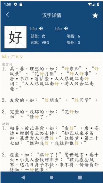 1.可以根据不同的词性来进行分级释义,方便查阅,这里的每个字条还包含注音笔画数以及部首等;