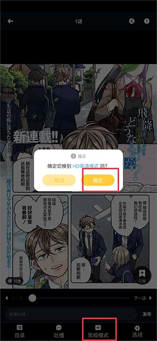 3、进入后先点击一下屏幕,然后点击下方的常规模式,并在弹出的界面中点击确定即可切换为hd模式。