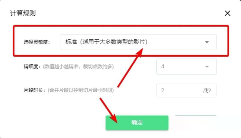 2.在弹出的【计算规则】窗口中选择合适的灵敏度以及精细度和片段时长等,完成后点击【确定】按钮。