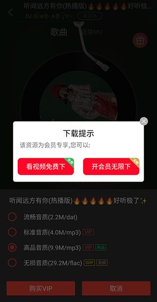 4、接着我们再选择歌曲的音质进行下载,其中流畅音质是可以免费下载的,标准音质、高品音质和无损音质是需要看广告或者开会员才可以下载的。