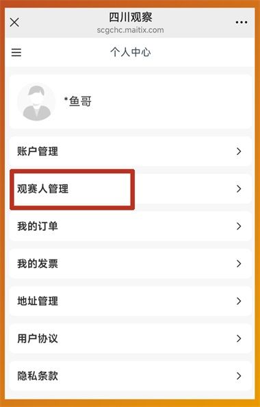在“个人中心-观赛人管理”中提前添加实名信息。