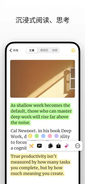 在锁屏或主屏幕展示未读的文章和已标注内容,随时利用碎片时间,开启专注阅读或回顾重点。