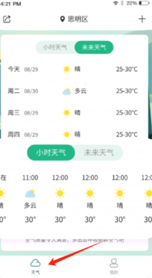 1、点击天气APP首页,定位思明区,显示今明天气及小时天气,含温度、天气状况等信息。