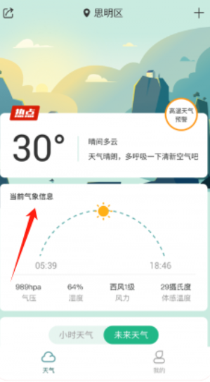 2、点击思明区当前气象信息页,有实时温度、气压、湿度等数据,还提供热点预警提醒。
