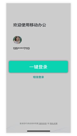 移动办公APP客户端的登录方式包括本机号码一键登录、短信登录两种方式,登录即注册。