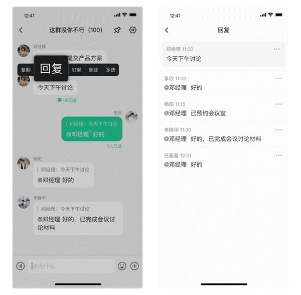使用路径:长按消息气泡选择【回复】->输入框发送回复内容->点击原文消息下方回复数进入回复详情页。