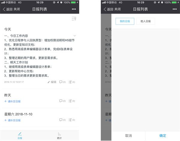 在工作台【日报】应用中定期提交日报,支持手机和PC端撰写。