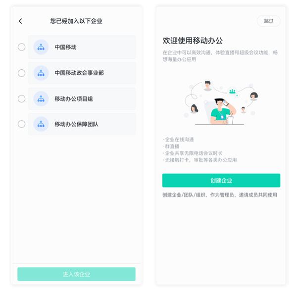 1、如果有企业,则会告知用户已加入的所有企业。支持用户勾选某个企业进入移动办公。