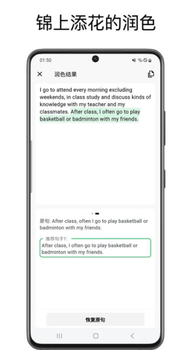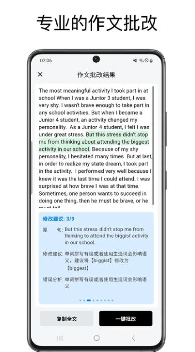 2、智能批改功能能够针对用户提交的英文文本展开自动分析,指出其中的语法错误,并给出相应的修正建议以及可供替换的表达。