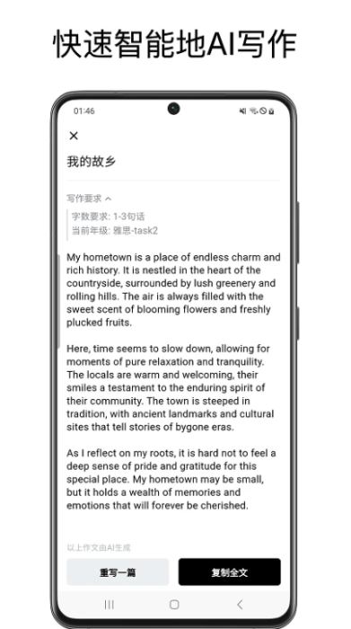 3、范文参考功能支持在文章生成后进行保存或查看,学习者可将其作为写作样例,用于分析文章结构、模仿句式表达以及积累词汇素材。