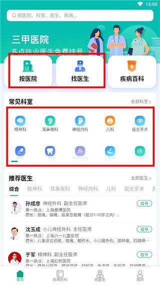 2、完善的搜索功能,搜医院、搜医生、搜疾病,更有热门医生推荐。