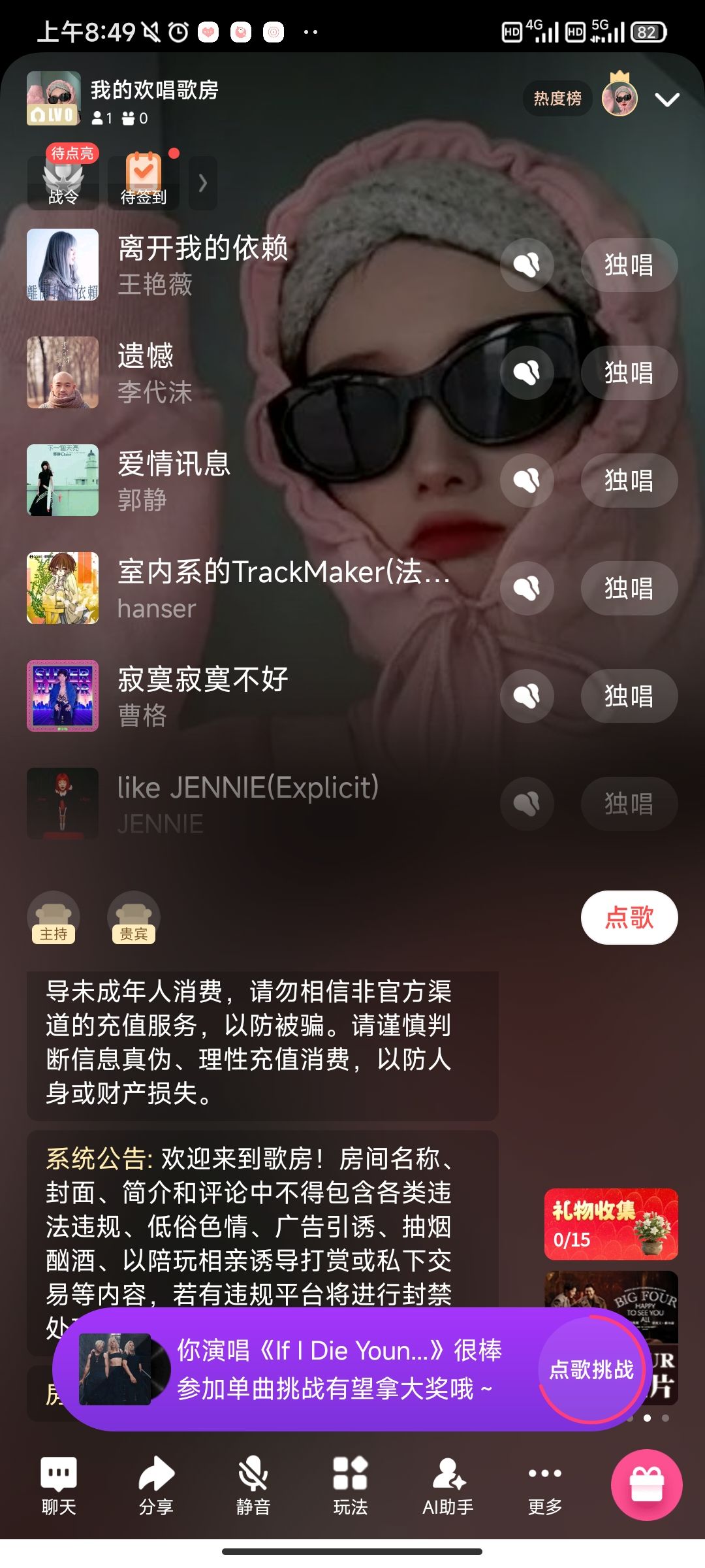 3、选择玩法类型,以听歌唱歌为例,接着点击马上开始