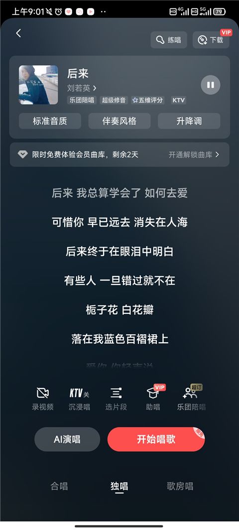 2、在录制界面,选择K歌模式,如独唱、合唱或片段唱