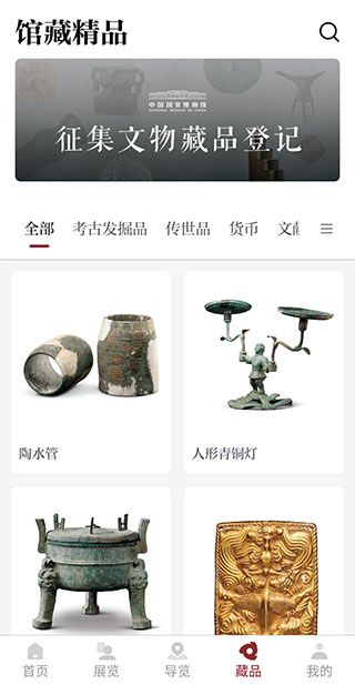 4、对于一些特别的馆藏精品,软件还特别设置了【藏品】页以供用户观赏,并且这里还有征集文物藏品登记入口。