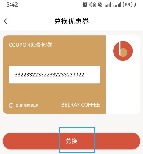2、将贝瑞优惠券或哇塞卡的券码,点击【兑换】;