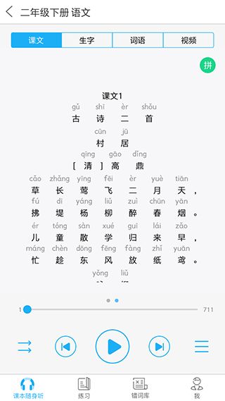 2、用户可以自己添加需要收听的材料,自由的控制播放进度条进行反复的收听,还能进行汉字学习的时候可以播放书写动画。