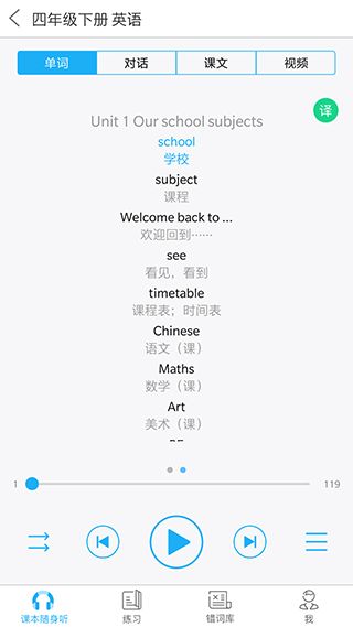 3、该软件收听单词的发音时可以打开翻译,可以有效的矫正孩子的口语发音,提高对语文和英语的听说读写能力。