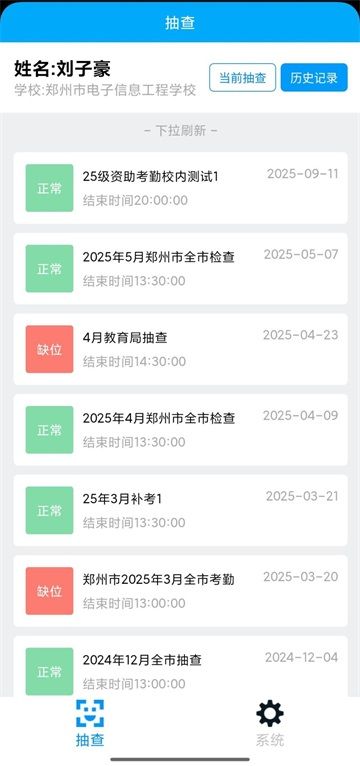 4、在抽查界面,点击历史记录,能找到历次考勤数据。反馈“正常”、“缺位”、“请假”等。