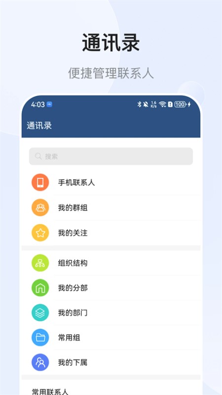 2、点击通讯录,能够为用户提供组织结构、部门、下属等相关管理