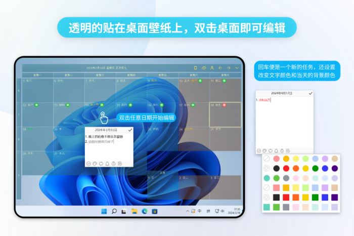 可以直接钉在桌面壁纸上,按快捷键即可返回到桌面,快速编辑或查看您的日程安排和日历信息