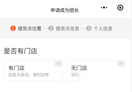 这个时候会进入到微信小程序,点击申请,我们可以选择是否有门店,点击设置提货点位置,完成后保存。