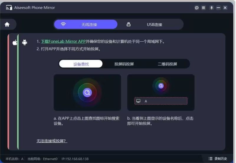 Aiseesoft Phone Mirror 提供不同的连接方式供您选择。 它支持通过 Wi-Fi 在移动设备和笔记本电脑之间建立连接。 如果您是 iOS 用户,您必须确保您的设备和计算机连接到同一个 WLAN 并打开 Screen Mirroring 进行连接。 如果您是 Android 用户,您可以通过扫描二维码或输入 PIN 码将手机镜像到 Wi-Fi。 但是,当您必须在没有 Wi-Fi 的情况下镜像您的手机时,您也可以将您的 Android 手机屏幕投射到带有 USB 的 PC 上。