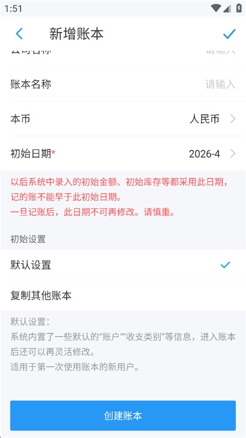 ▪ 新建账本的同时,需要设置初始余额和初始库存等数据。