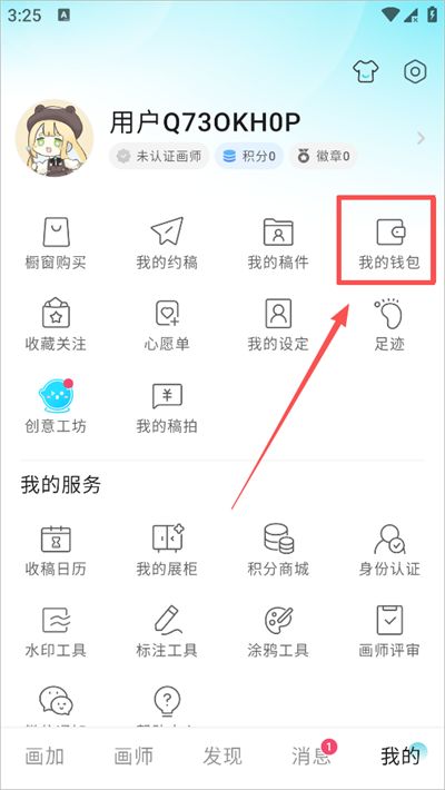 1、在申请画师认证之前,首先需要绑定收款方式。打开【我的】页面,点击【我的钱包】。