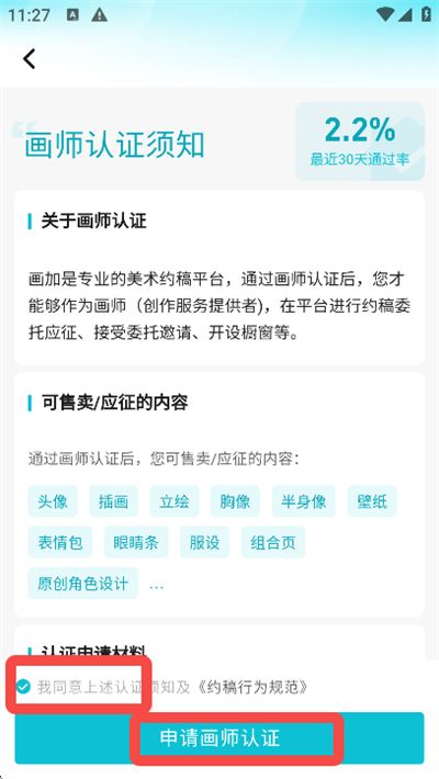 6、阅读画师认证须知,勾选同意后,点击【申请画师认证】。