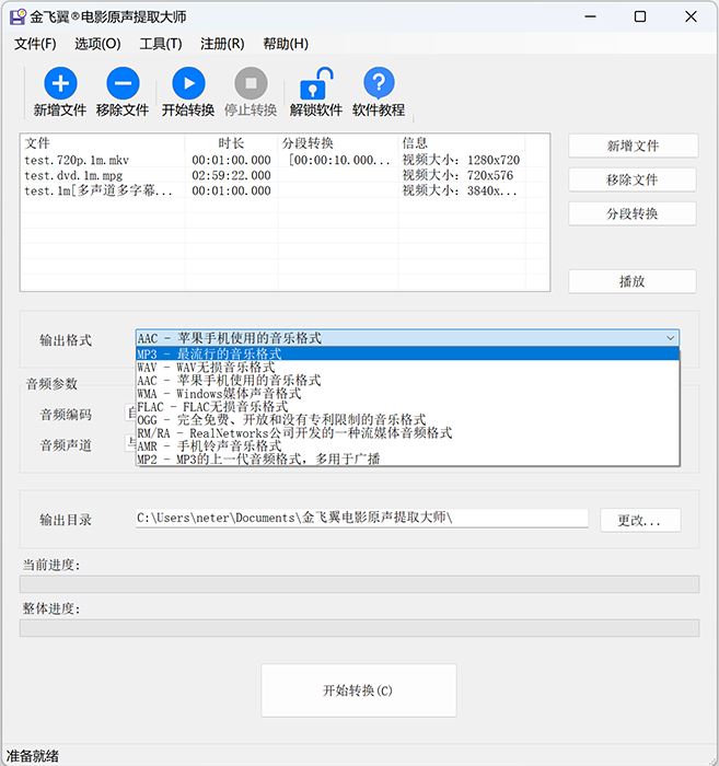 3、支持输出MP3、WAV、AAC、WMA、FLAC、OGG、RA、ARM和MP2共9种常见音频格式。