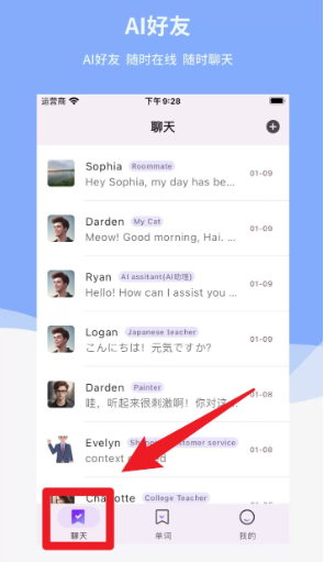 2. 登录成功后默认进入“聊天”界面,选择任意 AI 好友即可开启英文对话练习,支持自由输入或语音回复。