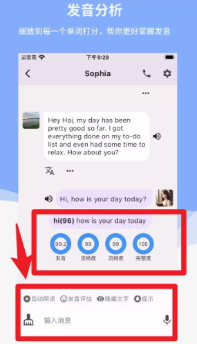 3. 在对话界面中点击下方语音按钮进行语音输入,系统会根据发音逐词评分,帮助你掌握语音细节与流利度。
