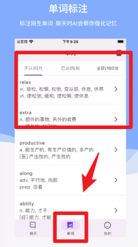 5. 切换至“单词”标签页,系统会自动标注你在聊天中遇到的生词,并进行分类整理,支持点击查看词义与用法。