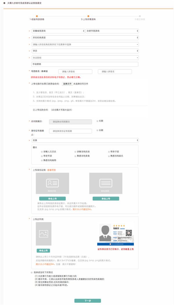 输入姓名、身份证号和导游资格证号进行提交。系统对输入内容进行校验,任一输入项校验不通过,系统都会给予错误提示。只有所有输入项都校验通过,系统会自动跳转到第二步。