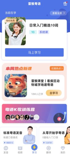雷猴粤语学习app是一款非常实用的粤语学习软件,软件功能非常强大,这里提供海量的学习资源,各种线上课、程粤语歌曲、粤语剧提供,能够帮助你轻松学习粤语,操作非常便捷。