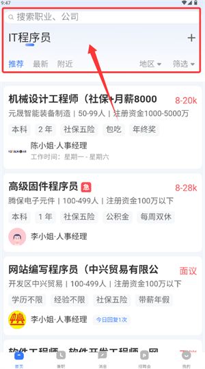 2、选择求职功能后,在上方搜索框输入心仪的职位或企业名称。