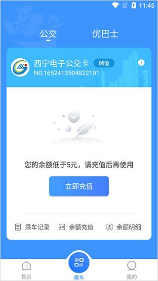 4、点击乘车即可进行扫码乘车。(注意:当余额低于五元时需充值才可进行扫码乘车)