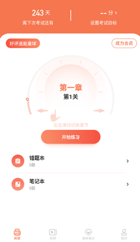 1、刷题界面,点击开始练习进入刷题闯关模式,还有错题本、笔记本功能,提供设置考试时间和考试目标