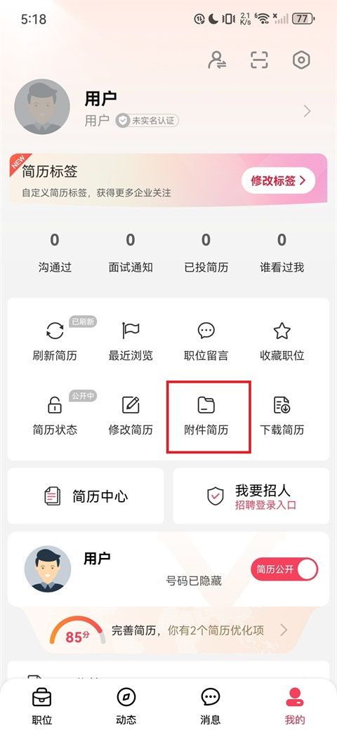 1、点击底部导航栏进入"我的"页面,点击"附件简历"。