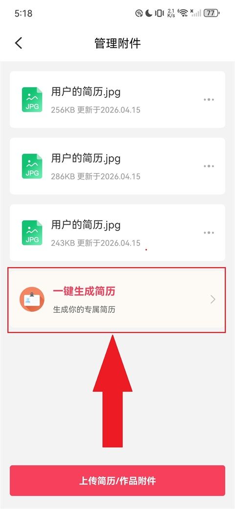 2、进入管理附件页,点击"一键生成简历"。