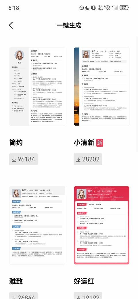 3、在一键生成页,选择喜欢的简历风格(如简约、好运红等)。
