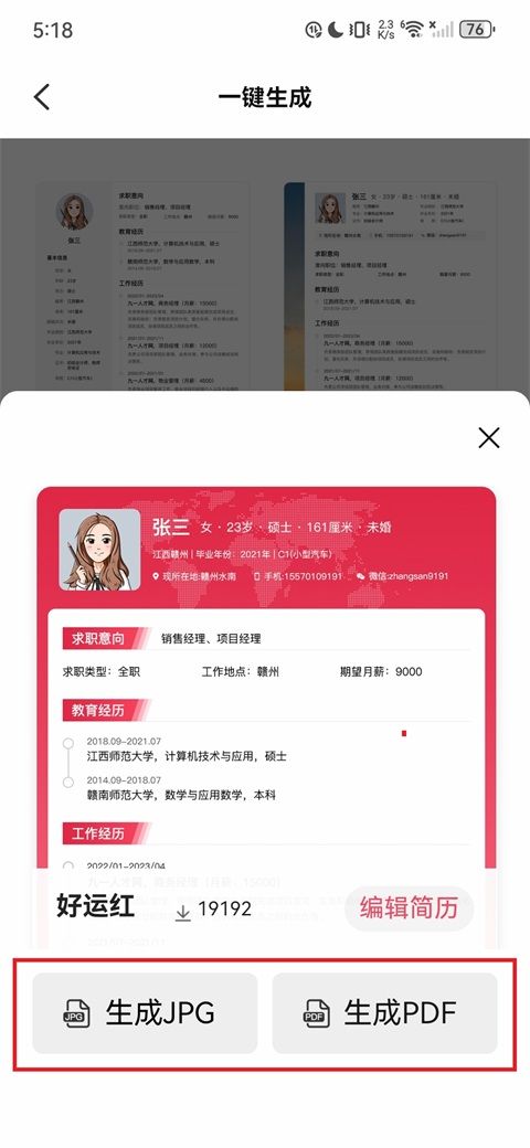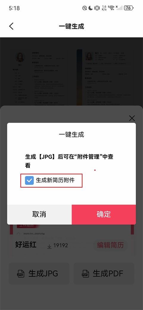 4、进入生成确认弹窗,生成的简历支持JPG、PDF格式导出。