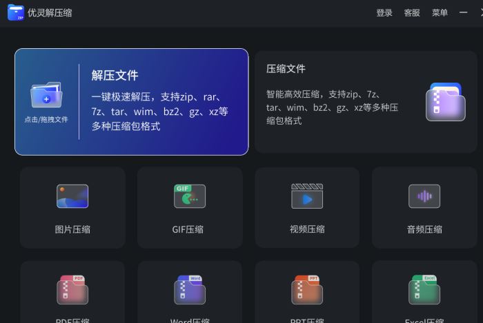 优灵解压缩电脑端使用的压缩软件,这款软件支持文件压缩、解压缩以及视频压缩、图片压缩、PDF压缩等,极速秒开50+格式,一键释放您的存储空间!AI预加载技术,大文件解压快如闪电等,欢迎下载使用。