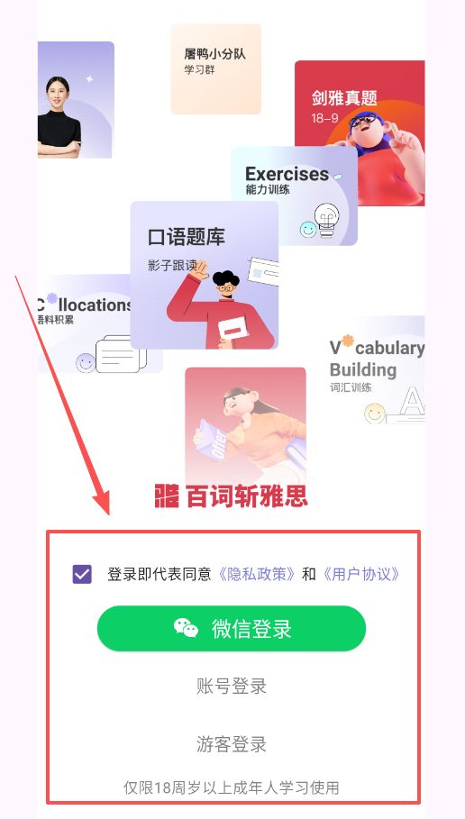 1、首先打开百词斩雅思App,在登录界面可以选择微信登录、账号登录或游客登录三种方式。