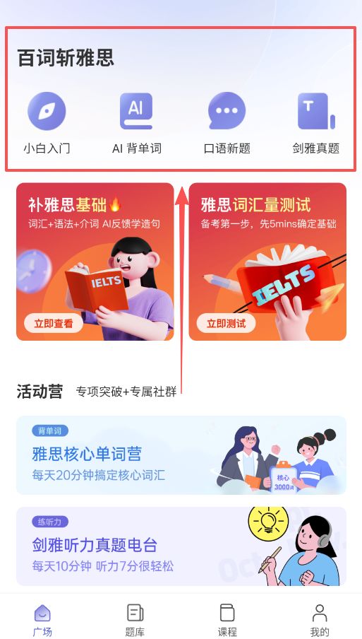 3、在广场页面可以发现很多实用工具,比如剑雅听力真题电台每天十分钟的碎片化练习,还有当季口语题库配合AI实时纠音。