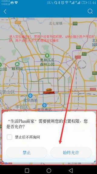 4、进入定位页面时,如若用户没有给予定位权限,APP会提示是否使用位置权限,用户需点击允许,才能继续定位操作,用户允许使用权限后,APP会自动获取当前位置。