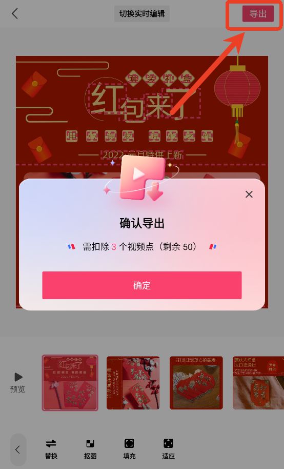 8、编辑完成之后点击右上角导出即可,会扣除3个视频点。