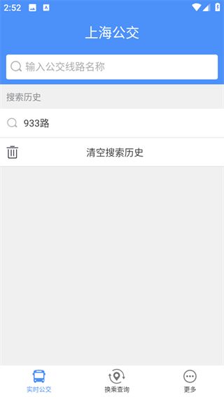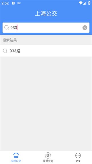 2、可以看到有实时公交与换乘查询两个板块,如果我们想要查询公交就在实时公交板块,点击搜索,选择自己想查看的公交车,输入路线即可,比如我们输入933路。