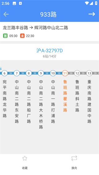 5、点击鲁班路瞿溪路,我们就可以看到我们需要等待13分钟左右,还有6站到达,并且还有详细的车牌号,非常方便。