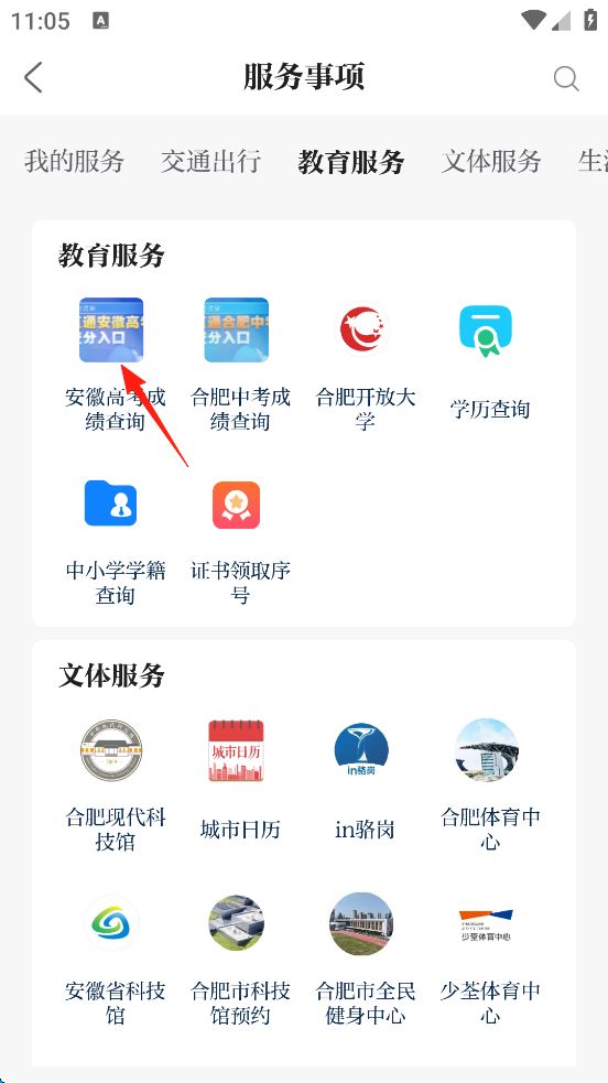 3、点击“教育服务”板块的“安徽高考成绩查询”。